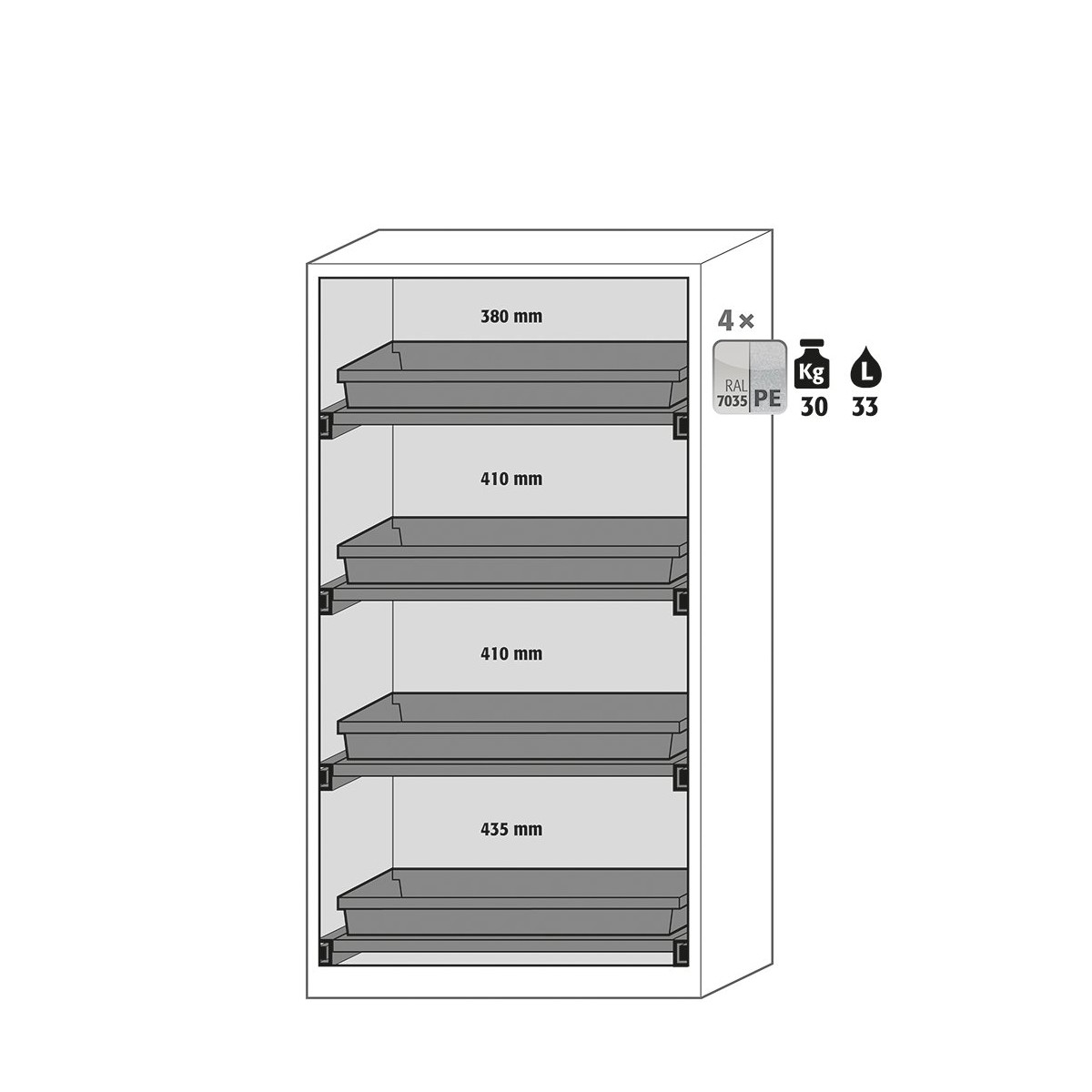 Vnitřní vybavení je volitelné mezi pevnými nebo výjezdnými policemi, které mohou být lakované nebo hliníkové. Skříně mají ve stropě předchystaný otvor k napojení odsávací hadice, průměru 75 mm, s možností napojení na odtah (nejsou vybaveny ventilátorem), mají integrované stavěcí nožky pro regulaci při nerovnosti podlahy a zabezpečené přirozené větrání otvory v podlaze.